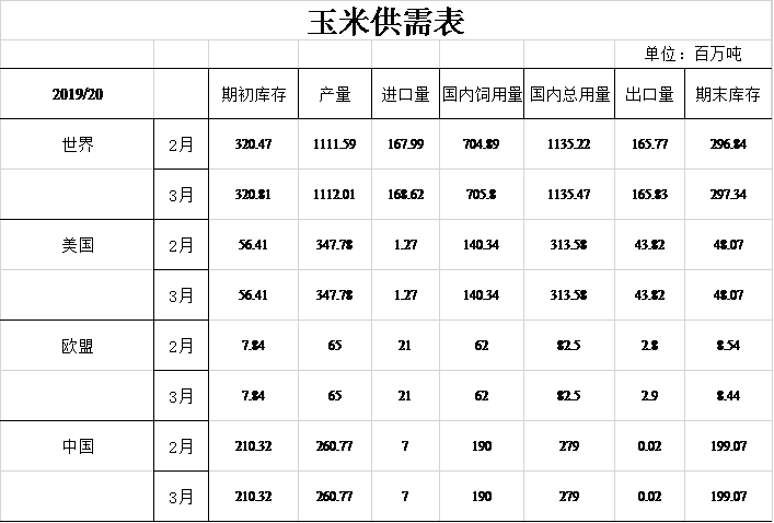 2019/20年度全球贸易的主要变化包括对乌克兰、南非和欧盟玉米出口的增加。2018/19年度至2020年2月的营销年度,巴西由于季末出货量低于预期,出口下降。阿根廷的增长被部分抵消。在2019/20年度,加拿大和秘鲁的玉米进口将增加,但菲律宾的玉米进口将减少。中国高粱进口量的增加是由于近期与美国的贸易。除美国外的其他国家的玉米期末库存增加,原因是南非、加拿大和俄罗斯的增长抵消了阿根廷的下降。全球玉米期末库存为2.973亿吨,较上月增加50万吨。