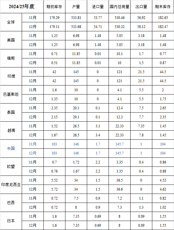 本月预估2024/25年度全球稻米的情况是:供应量和消费量略有下降,贸易量增加,期末库存略有减少。供应量减少30万吨,降至7.128亿吨,主要由于期初库存减少和生产量下降。其中,菲律宾的生产量下降幅度最大,原因是11月多次台风造成的损害。全球消费量减少10万吨,降至5.303亿吨,因为柬埔寨和尼泊尔的消费量减少,而巴西和印度尼西亚的消费量增加仅部分抵消了这一减少。全球贸易量增加120万吨,创下5810万吨的新纪录,主要来自于柬埔寨、越南、泰国和巴西的出口量增加。全球期末库存减少20万吨,降至1.825亿吨,但仍比2023/24年度高出300多万吨,这主要是印度库存增加所致。
