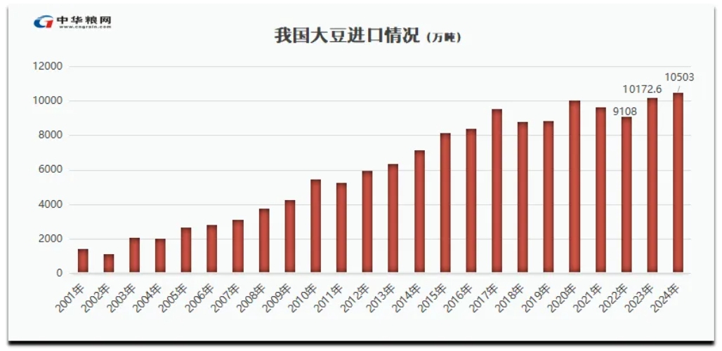 2024年美豆价格下跌、国内油厂压榨利润强劲以及买家因贸易问题担忧而提前做好准备,这些因素均推动2024年进口量创下历史新高,达到10503万吨,同比增长6.5%。在2024年的最后几个月里,尽管巴西的大豆价格更低,但中国买家进口的美国大豆数量仍高于往常。