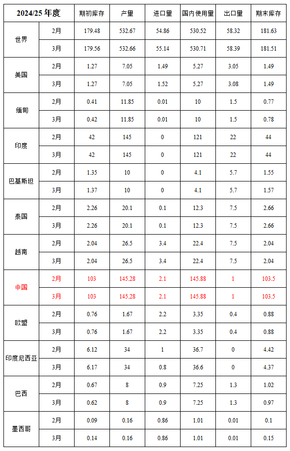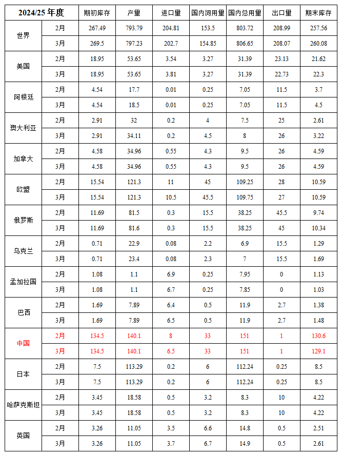 注:全球农业供需报告仅考虑发布时生效的贸易政策。此外,除非规定了正式的结束日期,否则报告还假定这些政策继续有效。美国对加拿大和墨西哥的所有根据《美墨加协议》涵盖的产品的关税已暂停至4月2日,互惠关税也定于4月2日开始实施。然而,在这些关税生效之前,本供需报告不会将其纳入商品预测中。尽管美国已暂停关税,但加拿大的报复性关税仍然有效。这些关税在供需报告估算中已有所体现,并假定将继续实施。美国对中国的关税以及中国对美国的报复性关税假定继续有效。